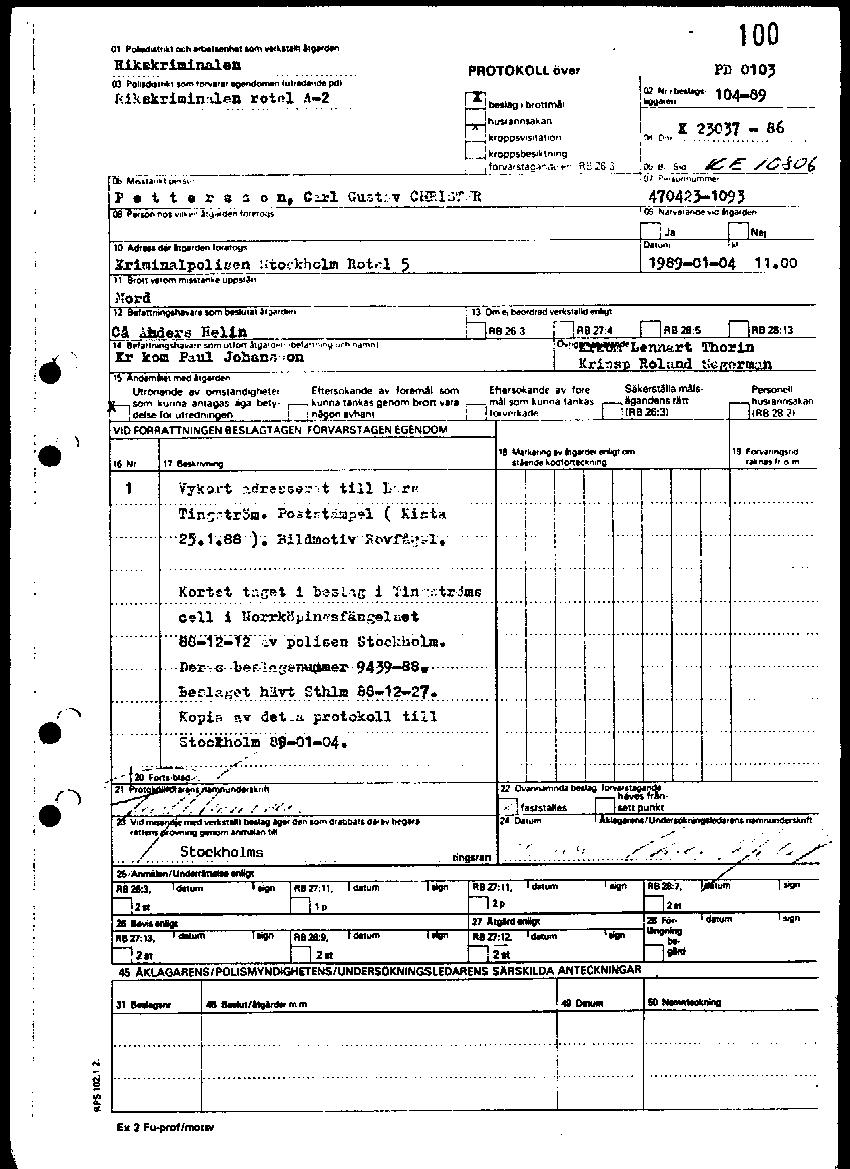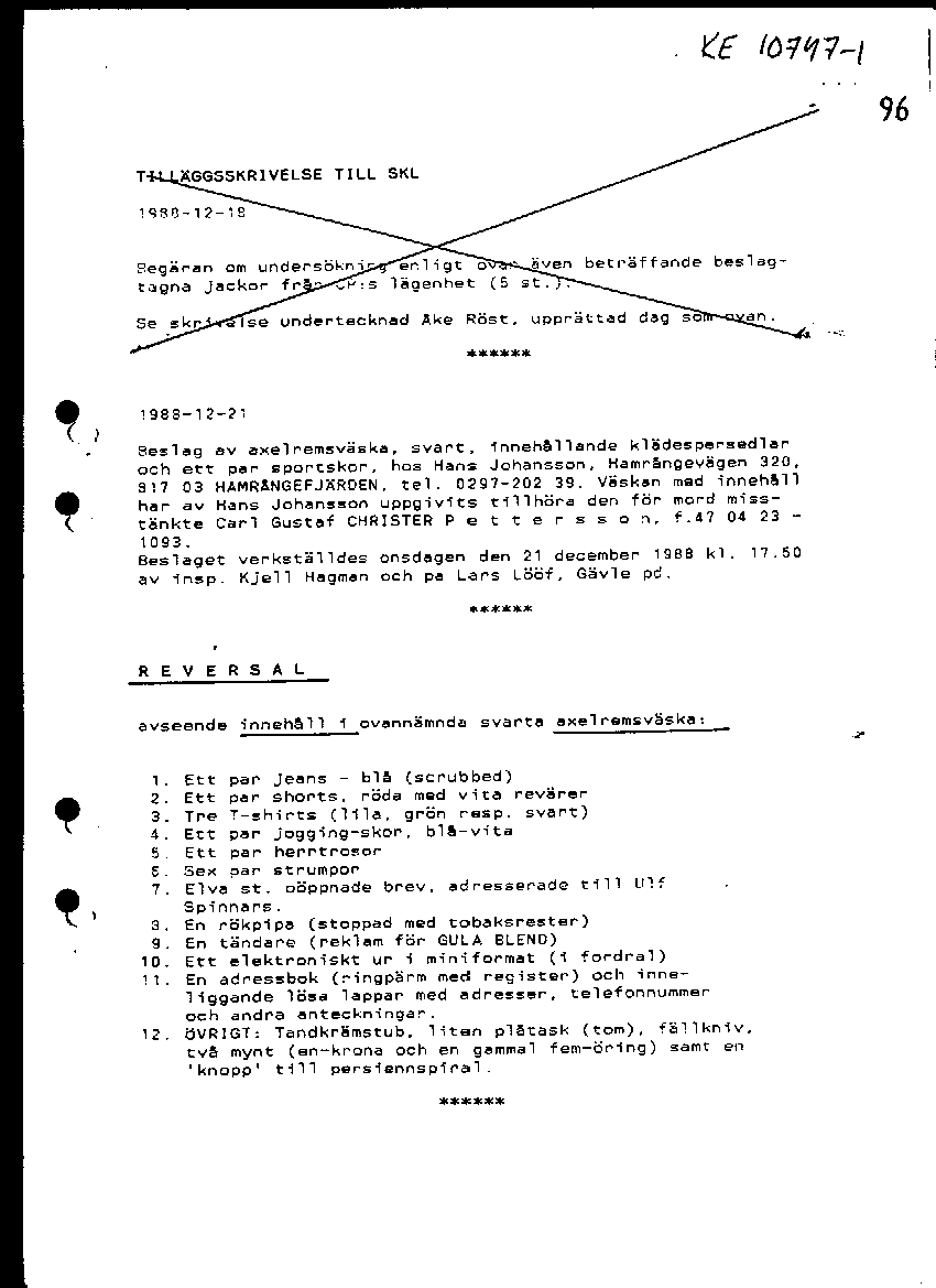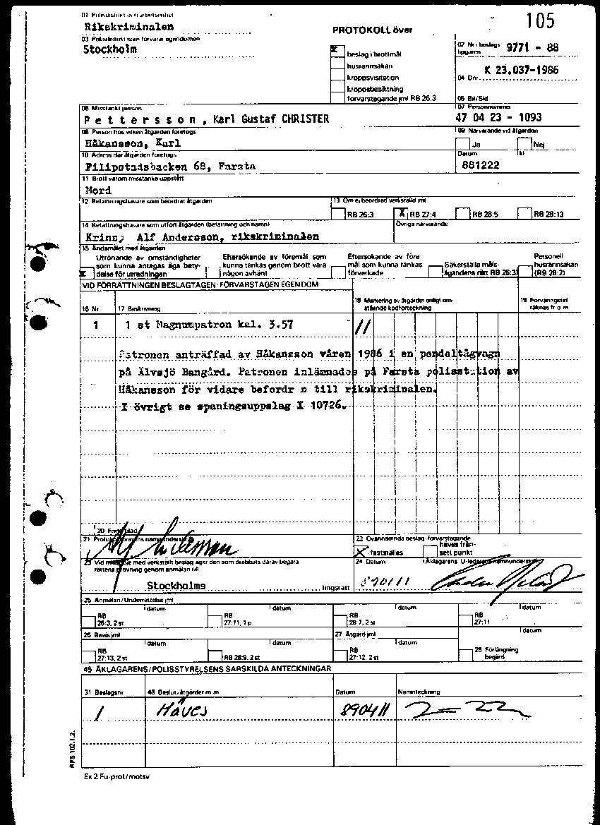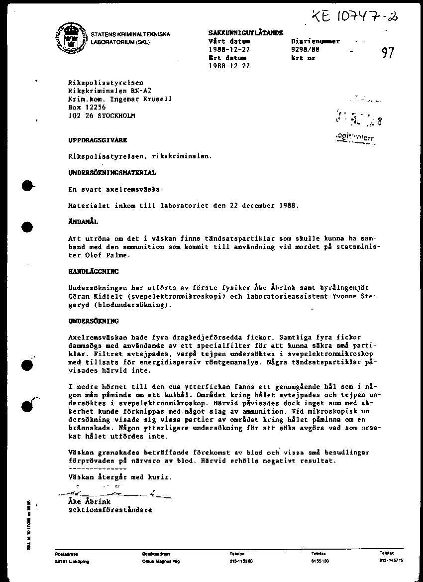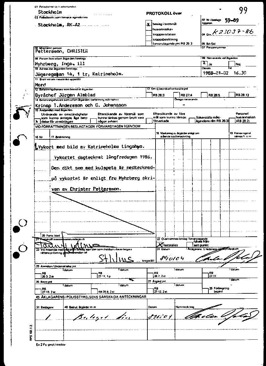 Sida 26 Smith & Wesson Sida 27 Hur en kula beter sig Polisens tekniska sammanställning + vittnen. Sida 36 Alla förhör Filmer, egna. Film 1 Rekonstruktion av Palmemordet Film 2 Rekonstruktion av Palmemordet del II Film 3 Rekonstruktion av Palmemordet del III Filmer, andra. |