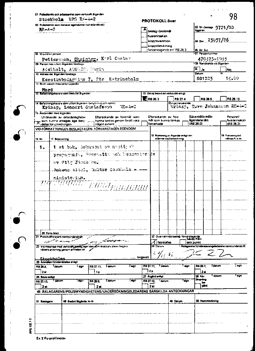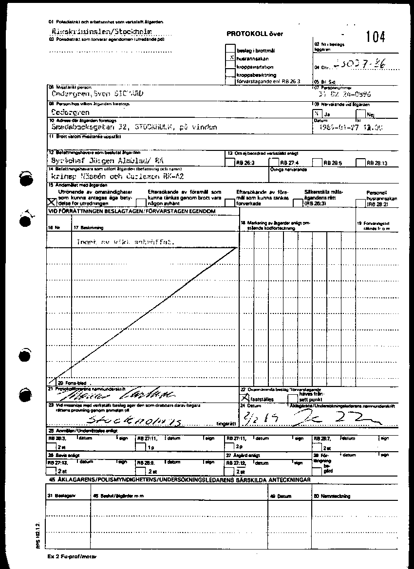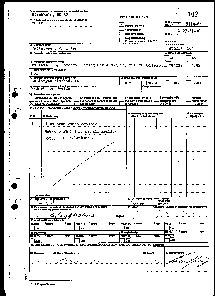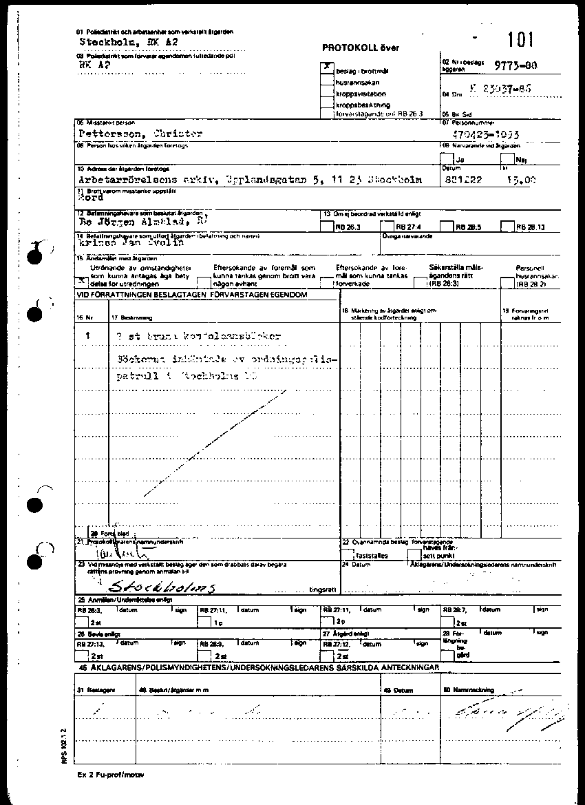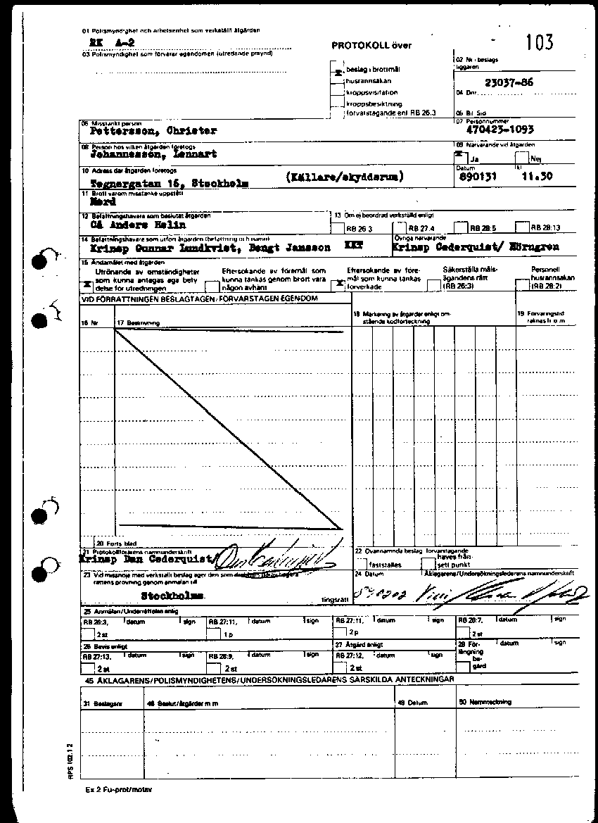 Sida 26 Smith & Wesson Sida 27 Hur en kula beter sig Polisens tekniska sammanställning + vittnen. Sida 36 Alla förhör Filmer, egna. Film 1 Rekonstruktion av Palmemordet Film 2 Rekonstruktion av Palmemordet del II Film 3 Rekonstruktion av Palmemordet del III Filmer, andra. |